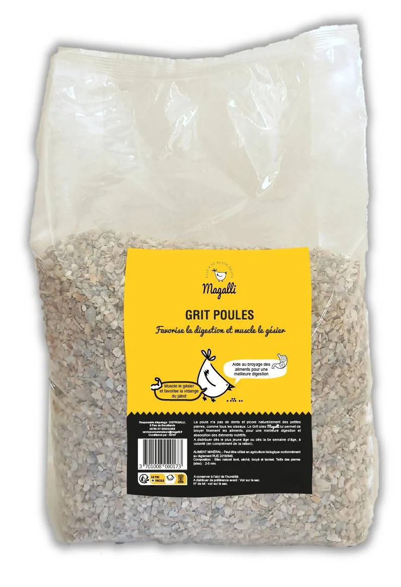 Le Grit Magalli est un mélange de minéraux et de petits graviers indispensables aux poules. Comme elles n’ont pas de dents, le grit joue le rôle de « broyeur » dans leur gésier tout en leur apportant le calcium nécessaire à la ponte.
